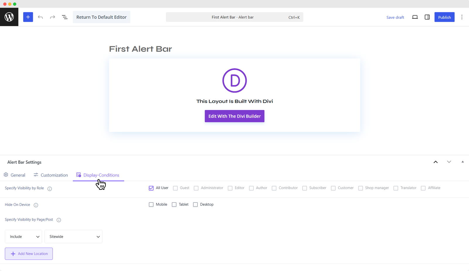 The Display Conditions settings allow you to control exactly who sees your alert bar, on which devices, and on which pages. This ensures your messages reach the right audience without being intrusive.